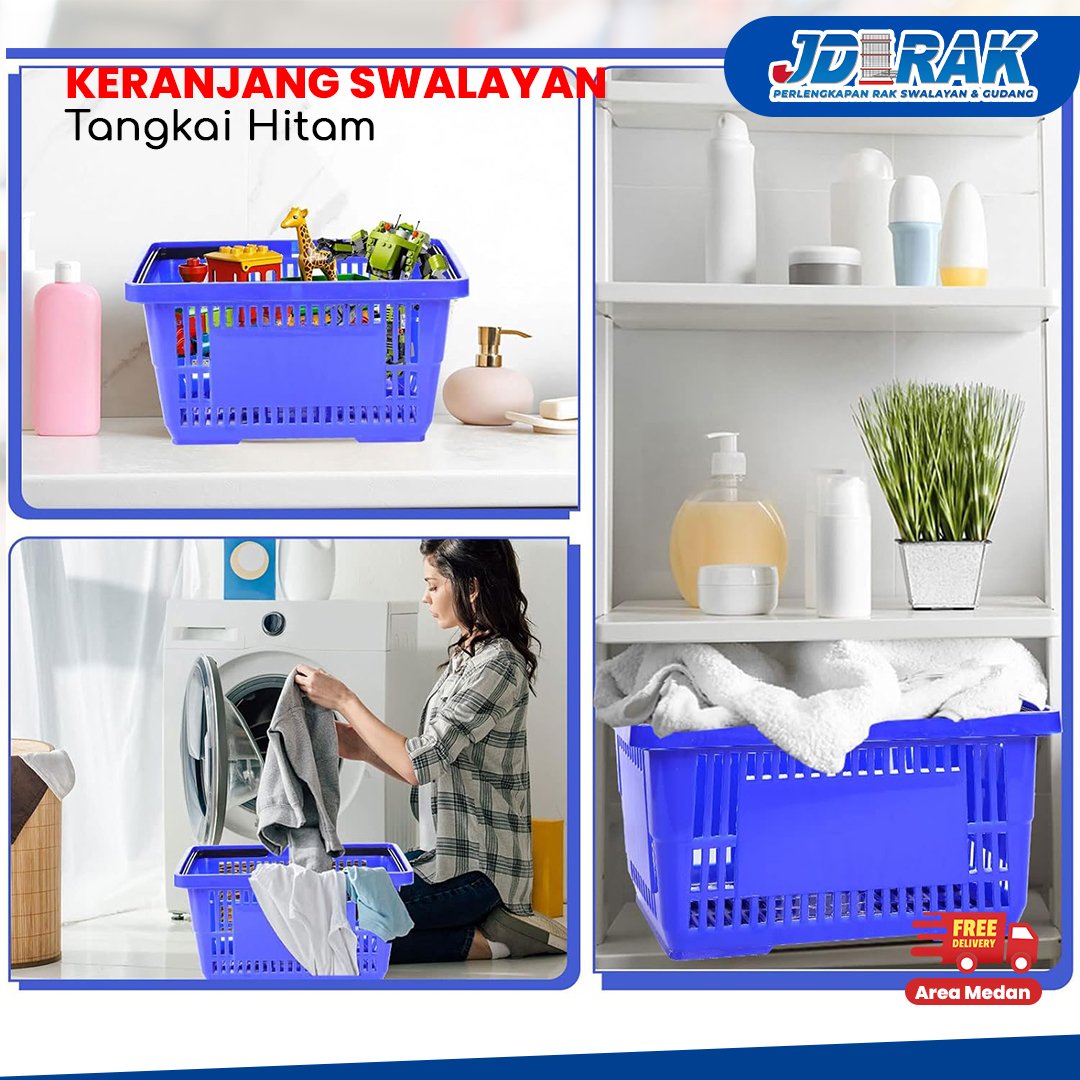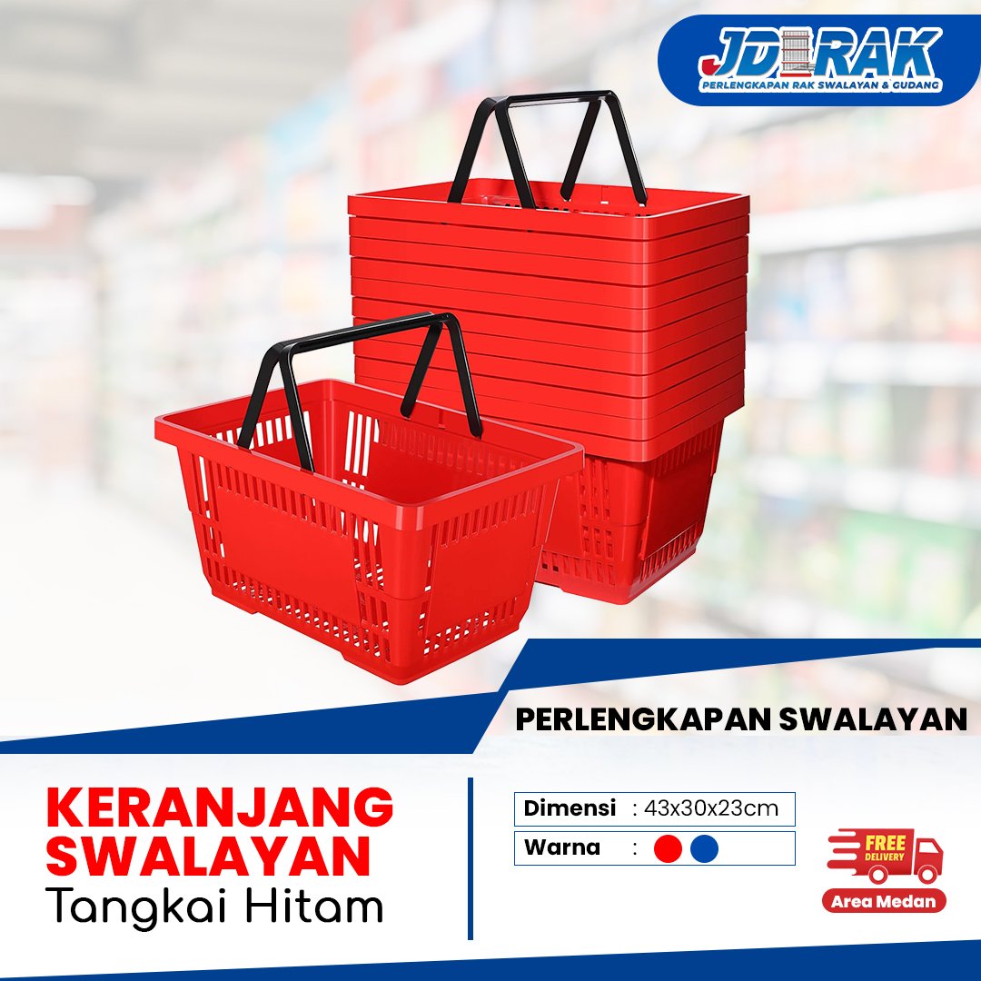 Keranjang Belanja Swalayan โ€“ Tangkai Hitam (Warna Merah & Biru) Keranjang belanja plastik dengan desain modern dan pegangan hitam yang kuat. Cocok digunakan di minimarket, supermarket, toko grosir, hingga toko harian. Ukurannya lebih besar, memberikan kenyamanan lebih saat membawa banyak barang.Spesifikasi :