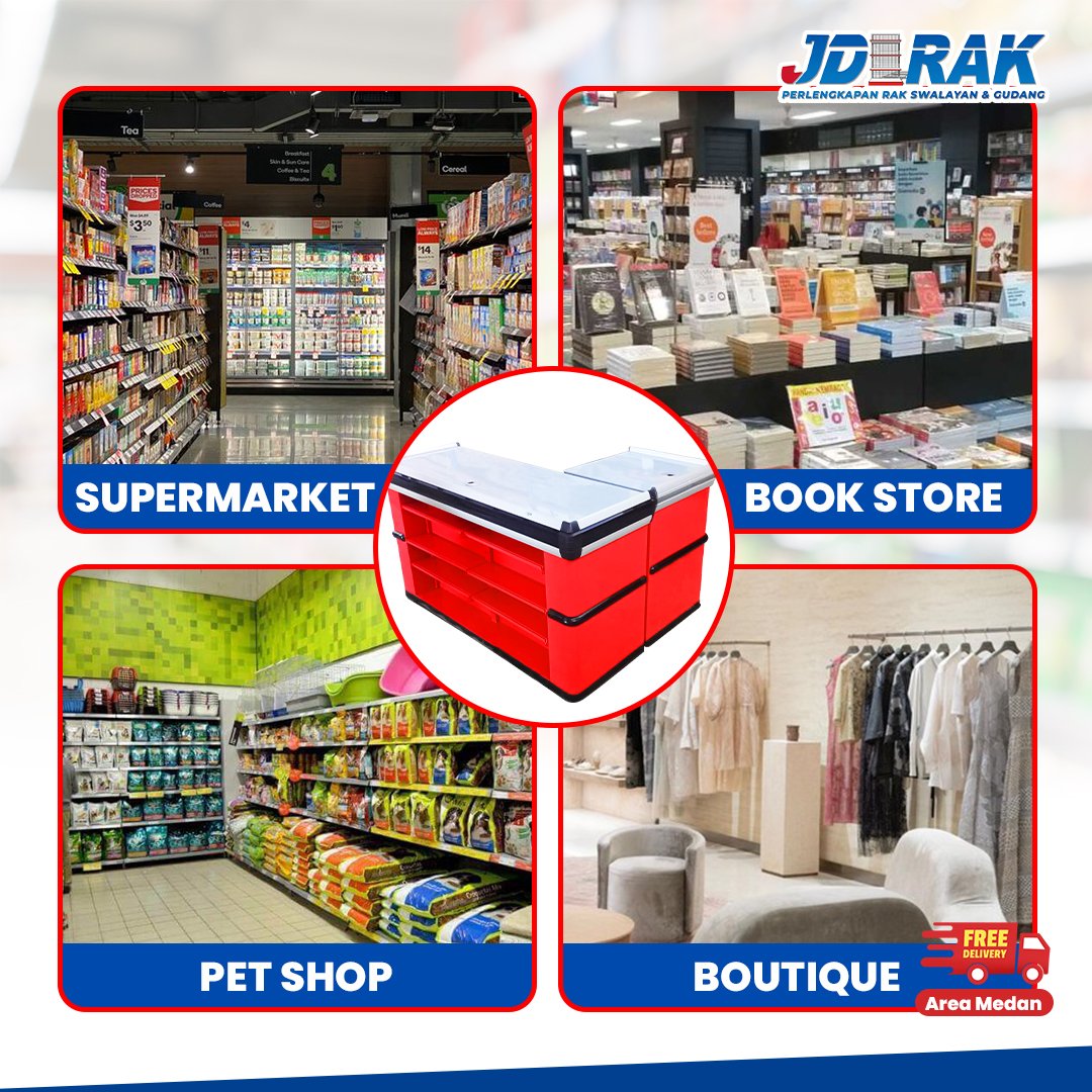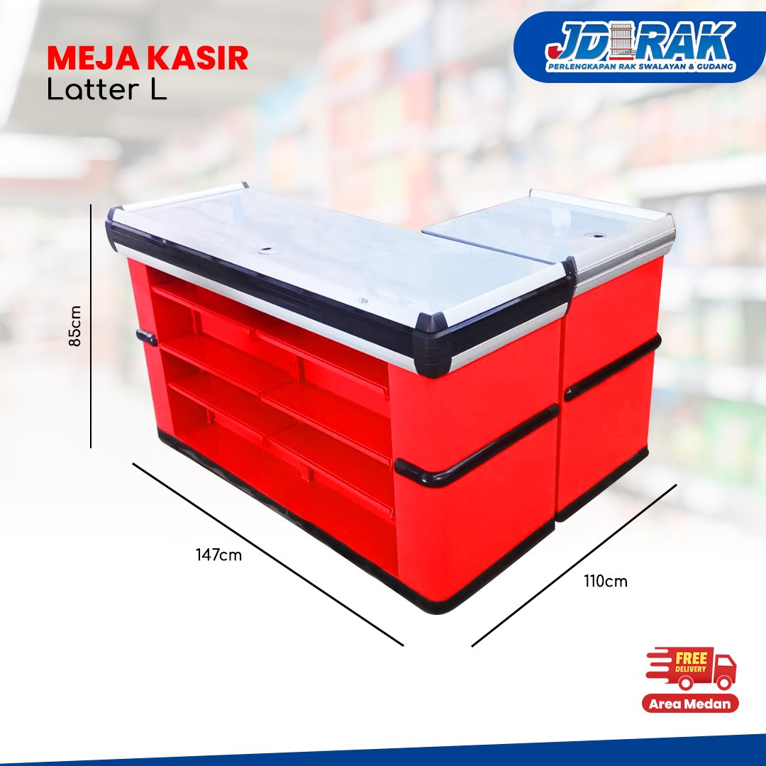 • Desain bentuk L, ideal untuk posisi kasir dan area pengecekan barang