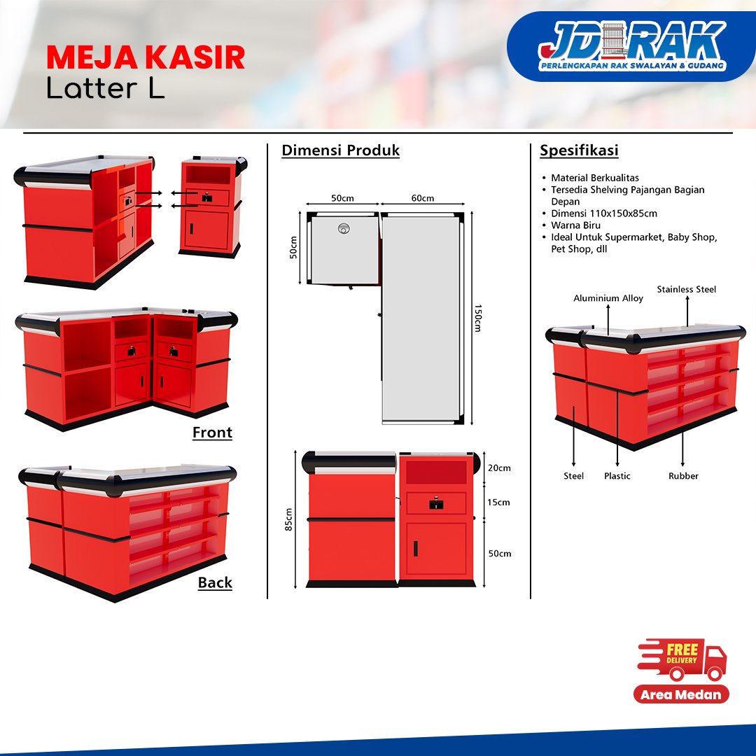 Meja Kasir Letter L Blue dan Red hadir sebagai solusi ideal untuk kebutuhan kasir di toko, minimarket, dan swalayan. Dengan desain ergonomis berbentuk L, meja ini memberikan ruang kerja yang luas serta fitur penyimpanan lengkap untuk menunjang kinerja operasional.Spesifikasi :