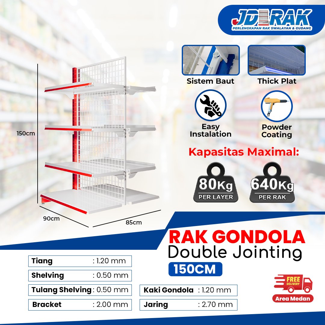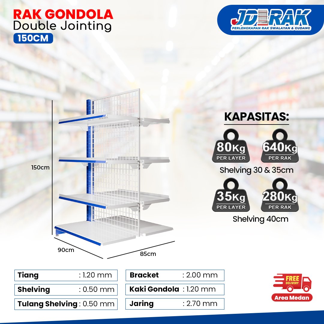| Kelengkapan Unit | – 1 pcs Tiang gondola – 1 pcs Jaring gondola – 2 pcs Penutup dasar samping gondola – 2 pcs Shelving dasar 90x40cm – 6–8 pcs Shelving atas 30cm–35cm – 12–16 pcs Bracket gondola 30cm–35cm |