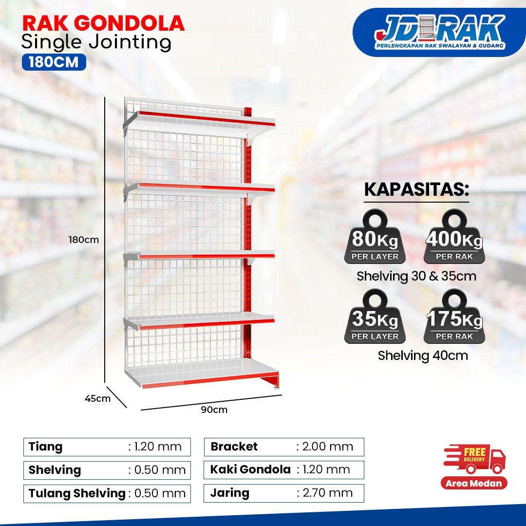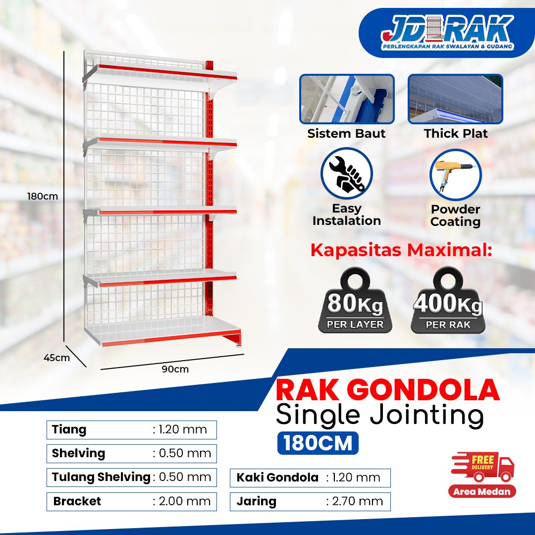 | Kelengkapan Unit | โ 1 pcs Tiang gondola โ 1 pcs Jaring gondola โ 1 pcs Penutup dasar samping gondola โ 1 pcs Shelving dasar 90x40cm โ 3โ4 pcs Shelving atas 30cmโ35cm โ 6โ8 pcs Bracket gondola 30cmโ35cm |