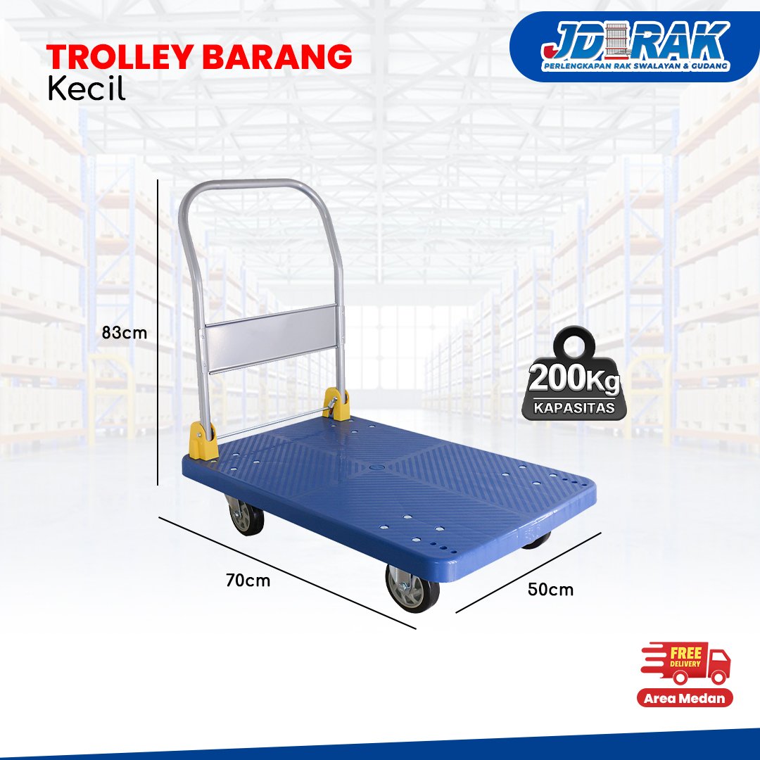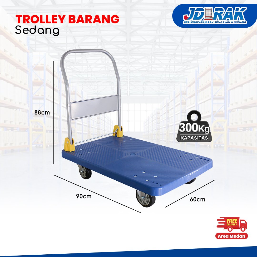 Troli platform ukuran sedang dengan kapasitas lebih besar. Cocok digunakan di toko besar, gudang, atau area distribusi barang. Memiliki desain anti-slip dan roda kuat untuk beban berat.